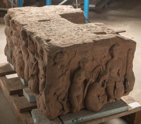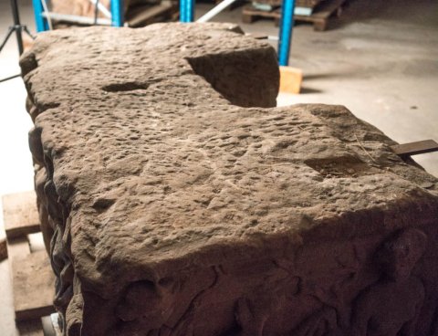 - unten und hinten abgebr., stark bestoßen, auf der Rückseite rechteckige Ausnehmung, in der Oberseite Klammerlöcher nach hinten, in der Mitte Hebeloch