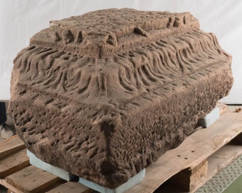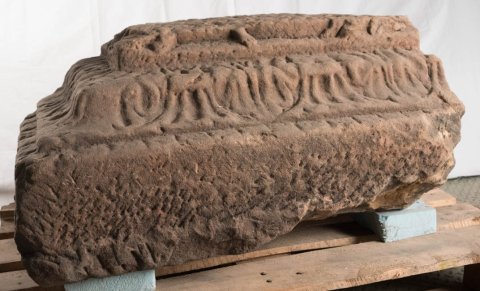 - Profil mit Palmettenfries, darüber auf den erhaltenen Seiten Ansätze der Reliefzone mit Füßen von stehenden Personen.