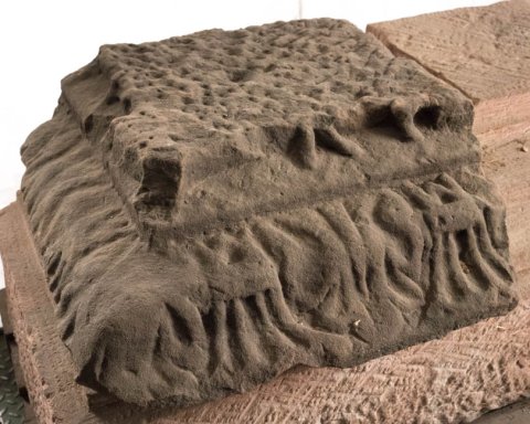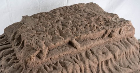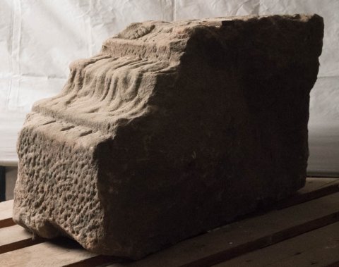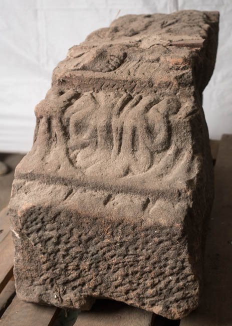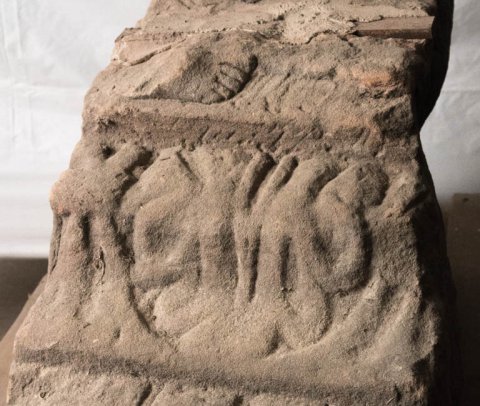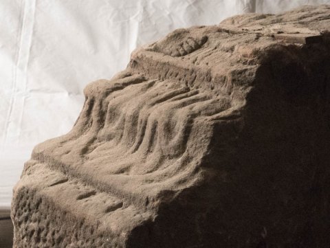 - 3 Fragmente, darunter 2 Eckblöcke; alle oben, 1 Eckblock auch unten abgeschnitten. Stark verwittert.