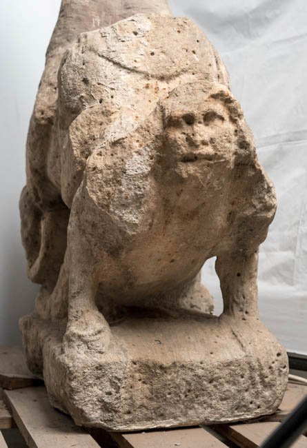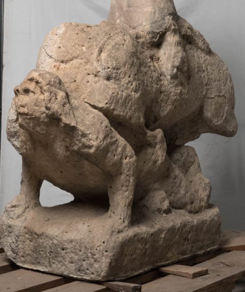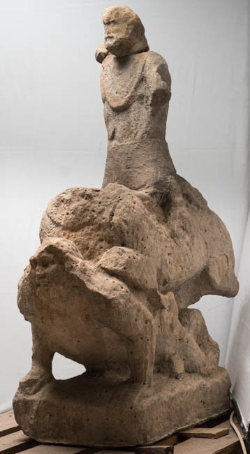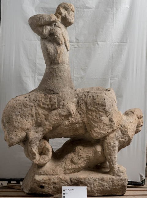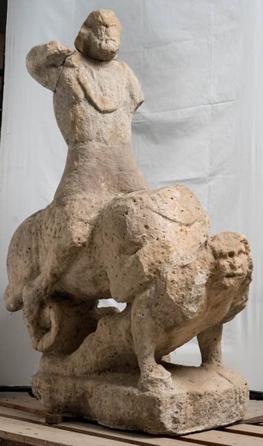 - stark verwittert. rechte Hand u. linker Arm des Jupiter, Kopf, Hals u. Beine des Pferdes abgebr., Unterleib des Jupiter ergänzt