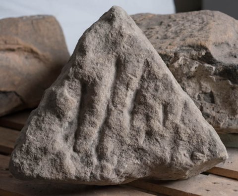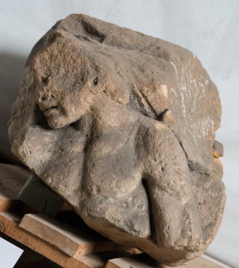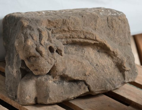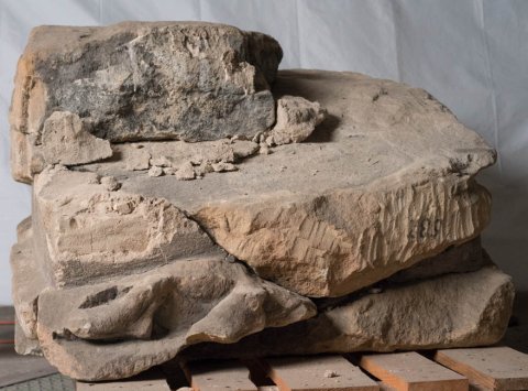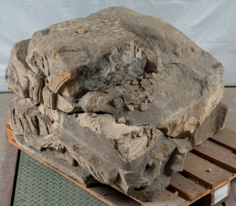 - 9 teils anpassende Fragmente, stark bestoßen u. verwittert. Maße beziehen sich auf den aus mehreren Bruchstücken zusammengesetzten Komplex. Die beiden Einzelfragmente sind 30 cm hoch, 43 bzw. 32 cm breit u. 50 - 34 cm tief.