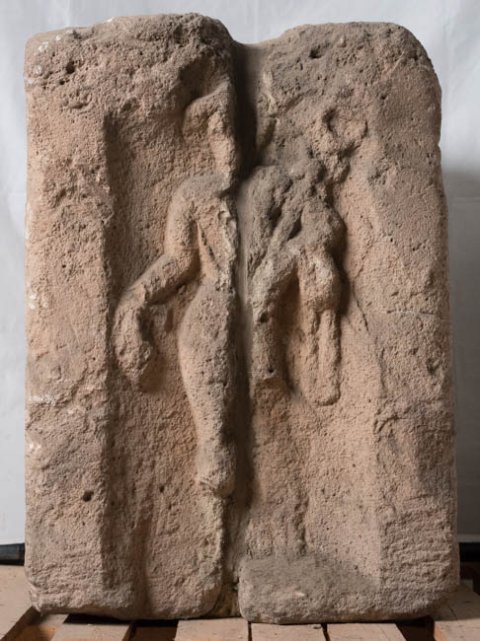 - stark verwittert, vertikal gespalten, eine Seite abgemeißelt