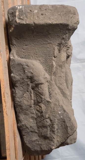 - Mythische Figuren: Fortuna mit Füllhorn im linken Arm, in der Rechten Ruder (?). Auf der links anschließenden Seite linke Schulter einer Figur (Hercules ?).
