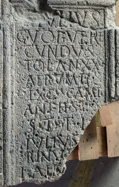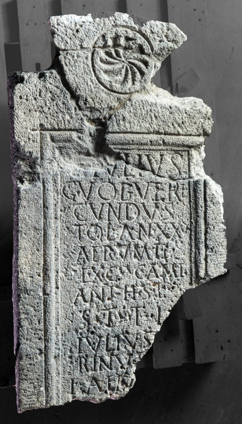- C(aius) Iulius / C(aii filius) Vol(tinia) Vere/cundus / Tol(osa) an(norum) XXV / aer(um) V mil(es) / l(egionis) X g(eminae) (centuria) Camp/ani h(ic) s(itus) e(st) / S(it) t(ibi) t(erra) l(evis) / Iulius [Ma]/rinus [et] / L(ucius) Aem(ilius) [---