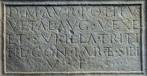 - D(is) M(anibus) Aur(elius) Potitus / vet(eranus) al(ae) Aug(ustae) vexe(llarius)(!) / et Surilla Triti / fil(ia) con(iugi) kar(issimae) et sibi / v(ivus) f(ecit)