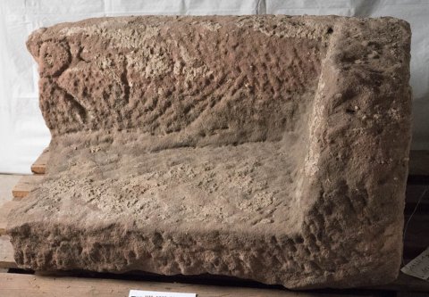 - Bank: Sitzfläche mit Arm- und Rückenlehne, Inschriftrest auf der Rückenlehne