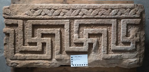 - Mäanderfries, gesäumt von schmalen Blattfriesen. Linke Ecke erhalten.