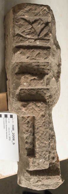 - rechts u. links hinten abgebr., Kanten tlw. abgeschlagen, ein nicht anpassendes Fragment stark bestoßen