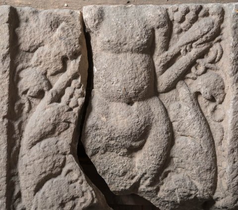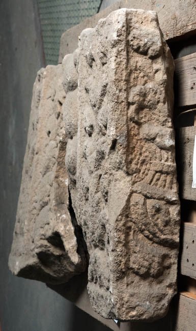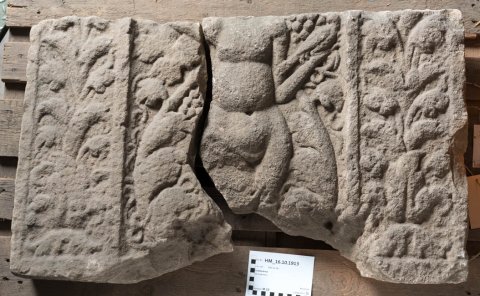 - Mythische Figur: zwischen Pilastern mit Akanthusornament Bildfeld mit aus Akanthuskelch auftauchender nackter Frau, auf dem linken Arm Vogel, oben Reste von Weinranken. Auf der rechten Nebenseite (Stirnseite ?) Krater mit Akanthuspflanze.