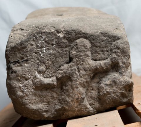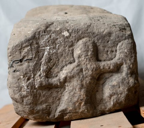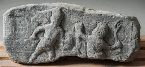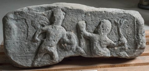- Block mit Reliefs auf vier Seiten (linke Seite nicht erhalten). Vorderseite (nur rechtes Drittel erhalten): schwebender Genius (Erot), der einen Kranz hält. Rechte Nebenseite: Mythos, Kampf zwischen Mars mit Helm, Schwert und Schild und Gigant mit Ast in der Hand. Rückseite: kämpfender Gigant.