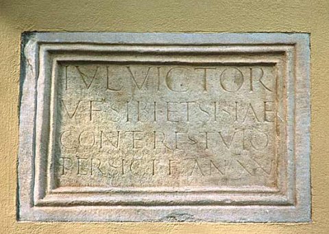 - Iul(ius) Victor / v(ivus) f(ecit) sibi et Sisiae / con(iugi) et Restuto / Persici f(ilio) an(norum) XV