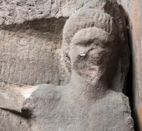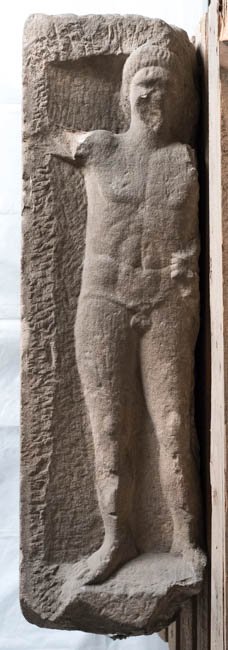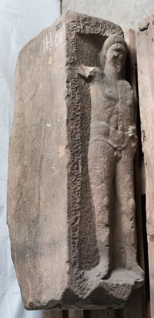 - Mythische Figur (Gott oder Heros ?): stehender nackter Jüngling, rechter Arm war erhoben, griff auf anschließenden Reliefblock über.
