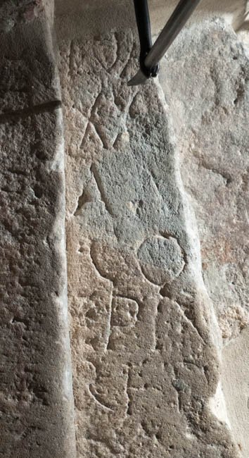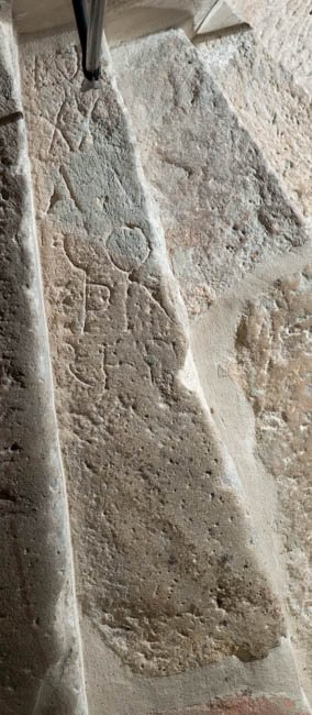 - im Dom, als Treppenstufe im NW-Turm (58. Stufe von unten)