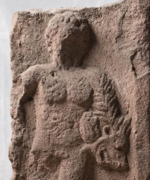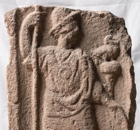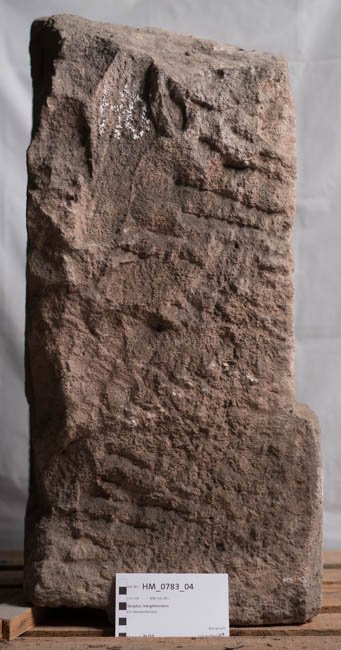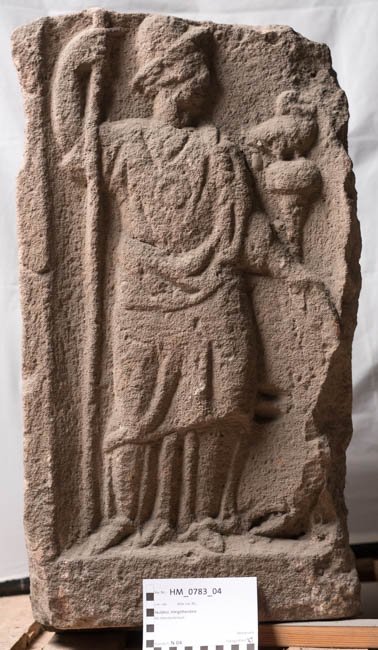 - Mythische Figuren: Minerva mit Helm, Schild und Lanze, neben der linken Schulter auf einem Kandelaber (?) sitzende Eule. Bartloser (?) Hercules mit Löwenfell und Keule. Auf einer der abgemeißelten Seiten Reste einer weiblichen Figur.