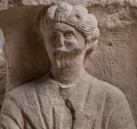 - Frau (Ehepaar): Brustbild einer weiblichen Figur mit aufgestecktem Haar und Ärmelgewand mit Umhang ?). Links schloss weitere Person an. Auf der Oberseite Ansatz eines Bogens.