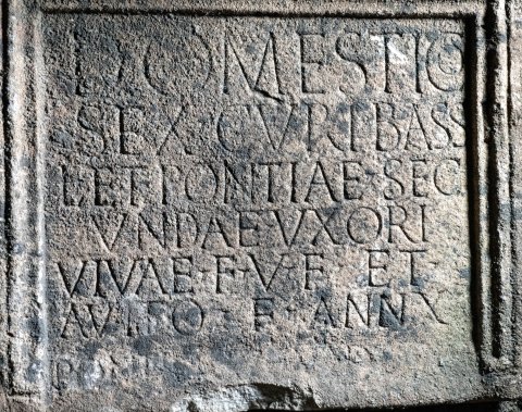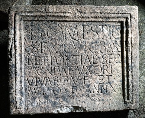 - Domestico / Sex(ti) Curi(i) Bassi / l(iberto) et Pontiae Sec/ undae uxori / vivae f(ilii?) v(ivi) f(ecerunt) et Avito f(ilio) ann(orum) X / Pontio Secundo an(norum) L[--]