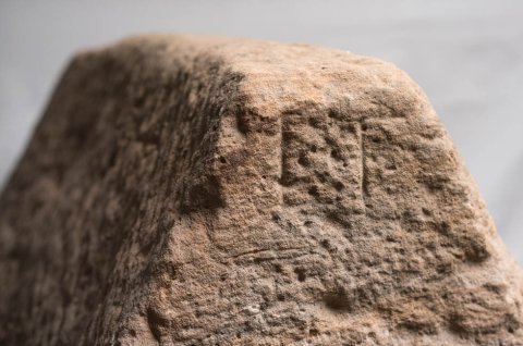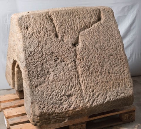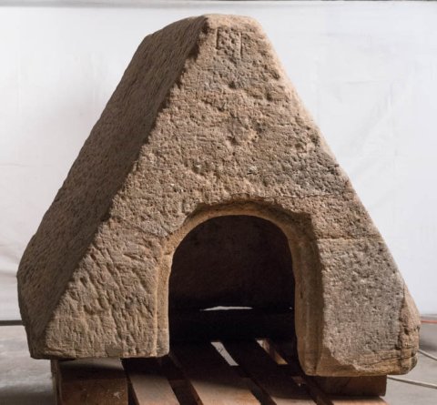 - Grabmal in Form eines steilen Satteldaches, in der einen Giebelseite rundbogige Tür mit gestuftem Gewände. In der Giebelspitze darüber zwei Buchstaben ?