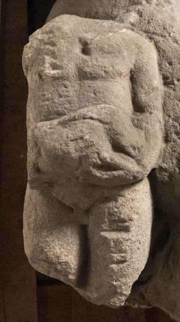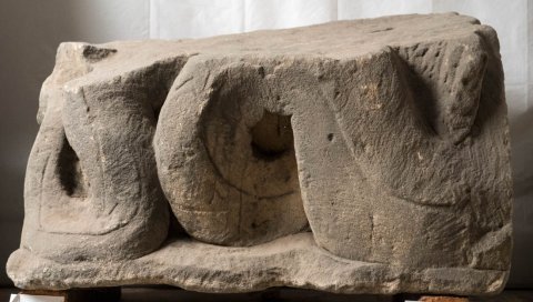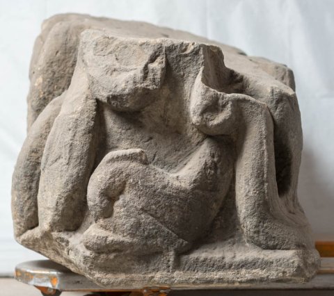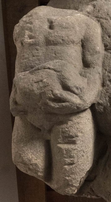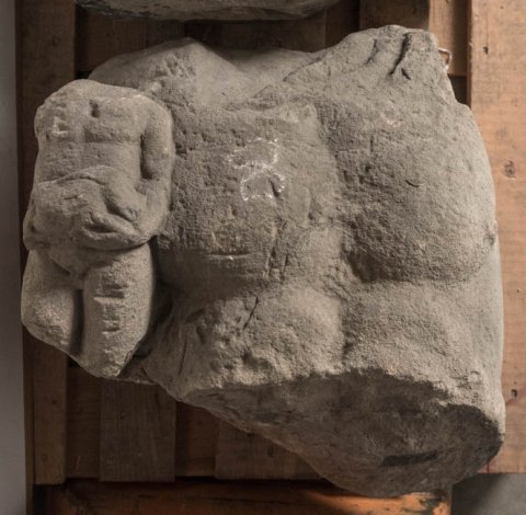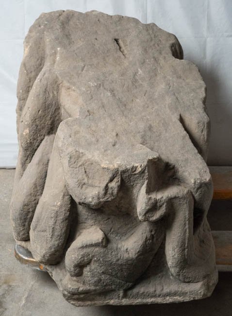 - Mythische Figur: Triton mit Erot im rechten Arm. Erhalten sind der kopflose Oberkörper und die Schlangenbeine des Triton, an die rechte Brustseite lehnt sich eine nackte geflügelt Knabenfigur mit Hase in den Händen. Zwischen den Enden der Schlangenbeine Delphin.