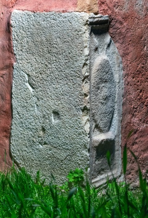 - Auf der linken Nebenseite Waffen: in hochrechteckigem Feld auf hohem Podest ein Ovalschild und zwei Speere.