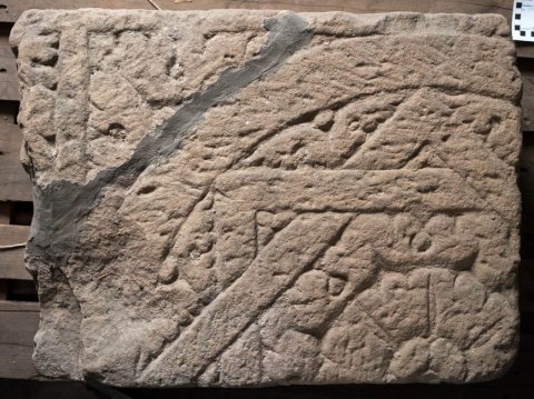 - Quadratisches Bildfeld mit Medaillon mit eingeschriebenen Quadraten, in der Mitte Rosette, in den Zwickeln Blattdekor. Links setzte weiteres Feld an.