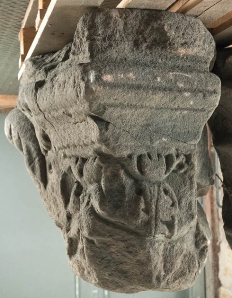 - Rechte obere Ecke eines Grabmals: Rest der rechten Seitenwand mit Pilaster an der Stirnseite und links anschließender Bogennische. Auf dem Pilasterschaft und über dem Bogen Akanthusornament.