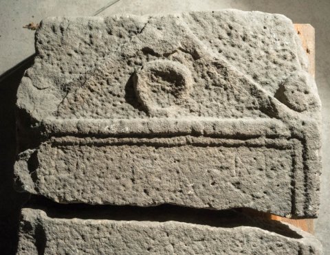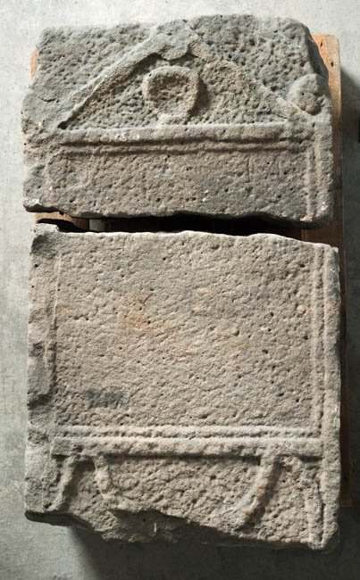 - Stele mit eingeschriebenem Giebel mit Schale (?), gerahmtes Schriftfeld, Sockelbild mit Girlande (?).