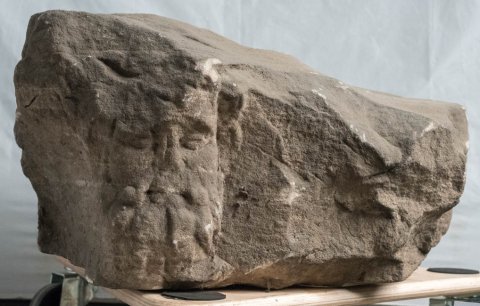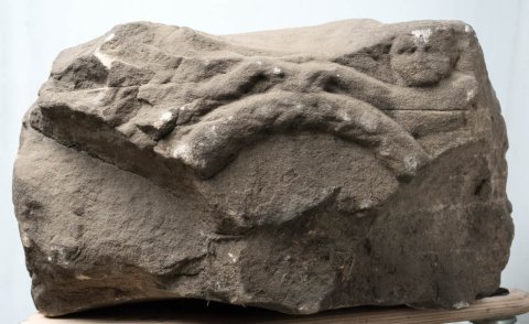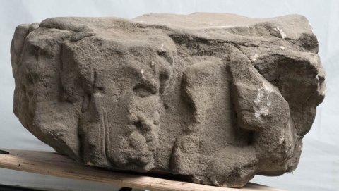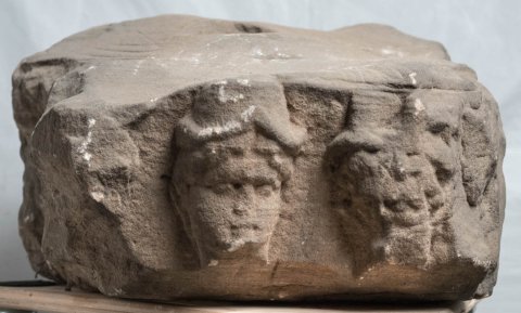 - Mythische Figuren: auf der Vorderseite Reste eines von Genien gehaltenen Kranzes. Auf der rechten Nebenseite Kopf eines bärtigen Gottes, an seiner linken Seite vermutlich weitere Gottheit. Auf der linken Nebenseite bärtiger Kopf mit Haube und ihm zugewandter Kopf einer Göttin. Auf der Rückseite ein abgeschlagener Kopf, Minerva (Mars ?) mit Helm und Mercur mit Flügelkappe. Die beiden bärtigen Köpfe sind größer als die der anderen Gottheiten.