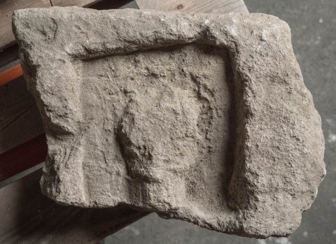 - rechteckige Bildnische, darin Umrisse eines menschlichen Kopfes mit Hals (Mann ?)