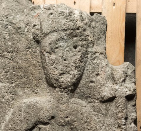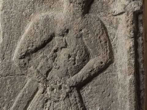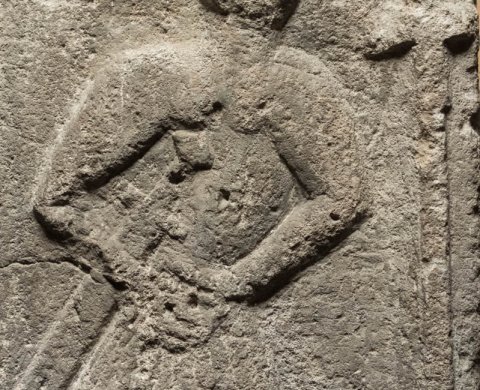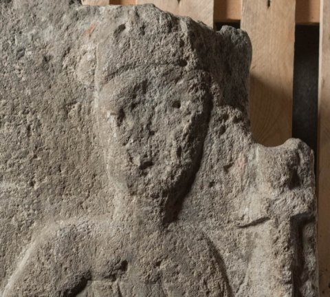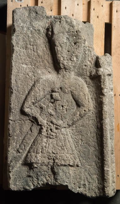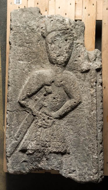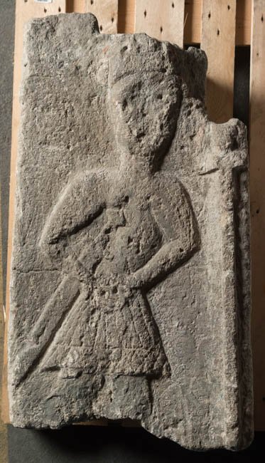 - stehender Mann in kurzem Gewand und Haube (?), an seiner rechten Seite Langschwert (Spatha), am rechten Reliefrand langer Stab mit Knauf (?)