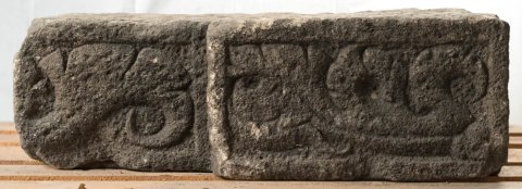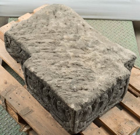 - Block mit verkröpfter Ecke, an Längs- und anstoßender Schmalseite gerahmte Felder mit vegetabilem Ornament. Zwischenfriesplatte eines Grabbaus ?