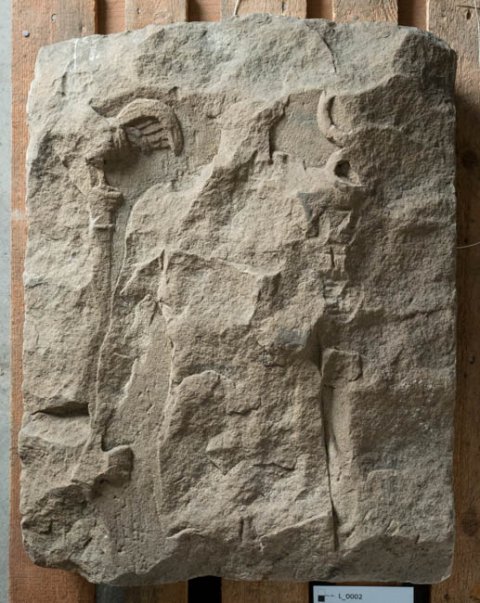 - Mythische Figur: Mercur mit Caduceus und Geldbeutel, neben der rechten Schulter Hahn auf Pfeiler.