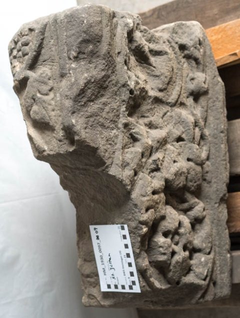 - Gerahmter Rankenfries (Akanthusranke mit Blüten), auf der anschließenden Seite Rest von Ranke mit Weinblatt und Blüte.