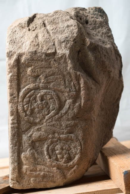 - Mythische Figur: auf der linken Nebenseite profilierter Bogen, darunter Kopf und erhobenen rechte Hand einer Mänade. Auf der Vorderseite Pilaster mit Weinranken.