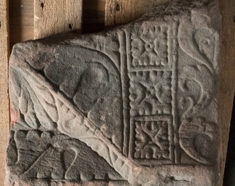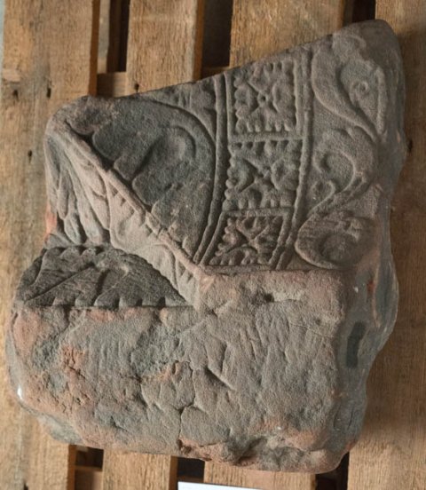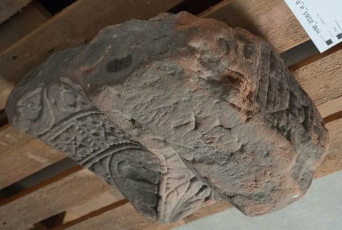 - Rest eines Bogens mit zwei Ornamentbändern auf der Unterseite (vorn Ranken, dahinter quadratische Felder mit Blattdekor). Anschließend gewölbte Decke, durch Diagonalrippen in Dreiecksfelder mit Blattfüllungen geteilt. Auf der erhaltenen rechten Außenseite Ornament aus Rosetten und Blättern.