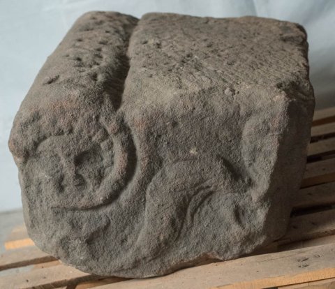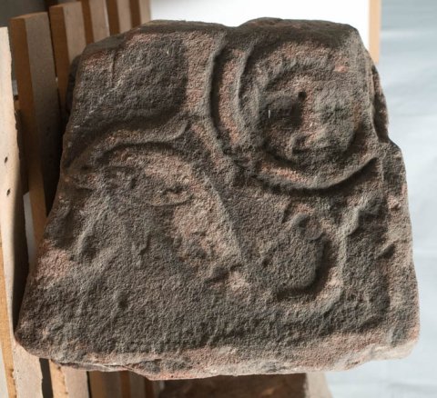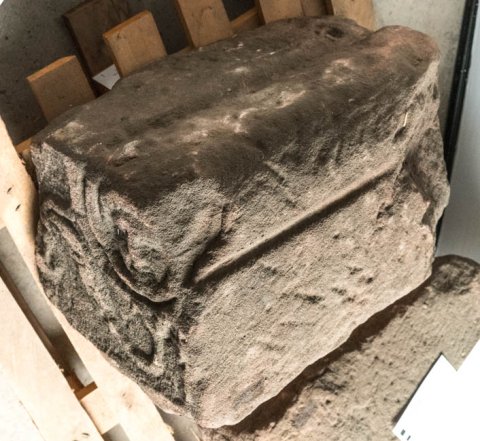 - 2 anpassende Fragmente, stark verwittert u. bestoßen, auf der Rückseite eckige Öffnung zum Hineinschieben der Aschengefäße.