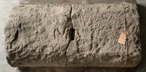 - in 2 Teile zerbrochen, grob geglättet, in der Oberseite Hebeloch