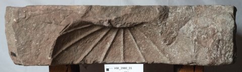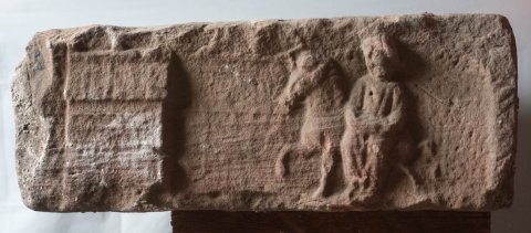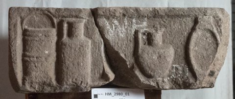 - Vorderseite: Muschelbaldachin. Linke Nebenseite : Gefäße (Eimer, zylindrische und bauchige Kanne, ovale Platte). Rechte Nebenseite: nach links reitende Epona, vor ihr Haus (Tempel).