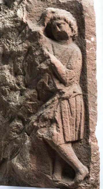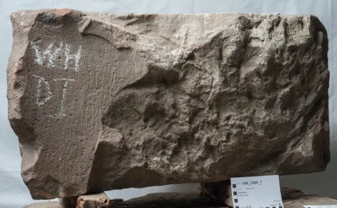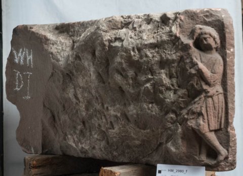 - Relief der Vorderseite abgeschlagen, Nebenseiten zur Hälfte erhalten, Kanten bis auf die rechte Hinterkante abgebr.