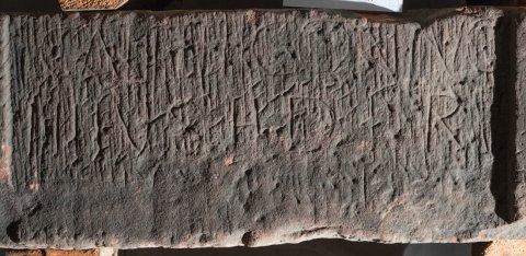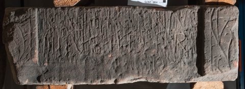 - oben abgeschnitten, unten verbr., Inschrift stark zerkratzt