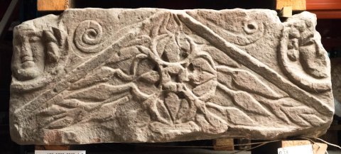 - Eingeschriebener Giebel mit Blütenvierpass und Ranken, über den Giebelecken pulvini mit Masken, von der Giebelspitze ausgehende Spiralhaken. Deckblock eines Grabaltars.