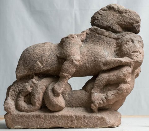 - mythische Figuren: über einen auf dem Bauch liegenden Giganten mit Keule in der Rechten hinweg reitender Jupiter