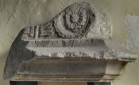 - Über profiliertem Gesims Volutenpolster (pulvini) mit Blattschuppen und Rosette. Teil eines Grabaltars ?