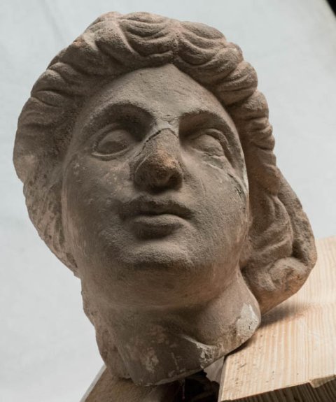 - Mythische Figur (?): Kopf einer Frau (Göttin ?) mit Binde im Haar und über den Hinterkopf gezogenem Mantel.