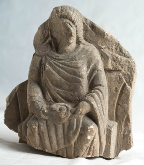 - Mythische Figur: thronende Göttin (Matrone) in Ärmelgewand und Mantel mit Scheibenfibel, in den Händen Schale mit Früchten.