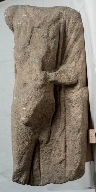 - Mythische Figur: stehende männliche Figur, nackt bis auf Mantel über der linken Schulter, über der Brust verknotete Nebris, in der linken Hand Gefäß (?). Dionysos - Liber Pater ?