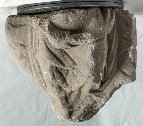 - Unterkörper und Oberschenkel einer weiblichen Figur mit Mantel um Hüften und Beine, Körper entblößt. Mythische Figur (Venus ?).