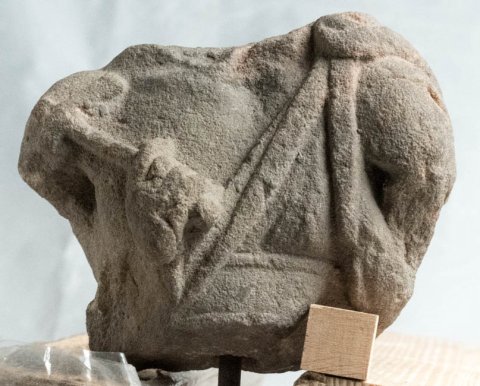 - Mythische Figur: Oberkörper des Vulcanus mit Exomis und breitem Gürttel, in der rechten Hand Hammer.