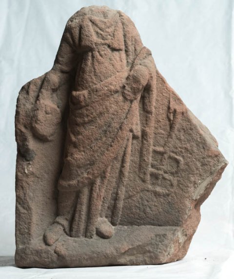 - Mythische Figuren: vom Mercur nur Caduceus erhalten, Rosmerta in Tunica und Mantel, in der Rechten Schale, im linken Arm Füllhorn (?).