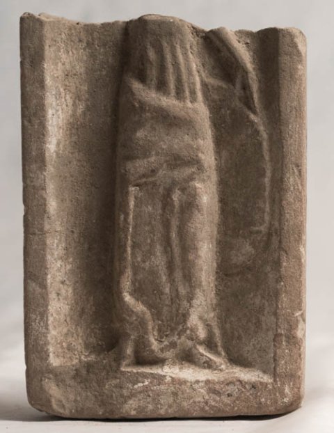 - Mythische Figur: stehende Göttin (Minerva ?) in langem Gewand und Mantel, linke Hand auf dem Rand eines Schildes.