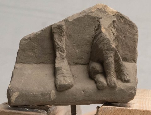 - Mythische Figur: linker Fuß mit Sandale, daneben sitzender Hund. Diana ?